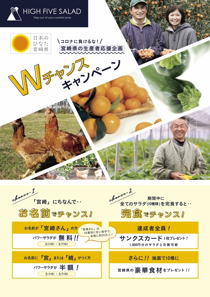 3月1日(月)〜31日(水)の期間中、宮崎県の生産者応援を目的に、宮崎県が日本初の「パワーサラダ専門店HIGH FIVE SALAD」の全店舗・全メニューに宮崎県食材を価格据え置きで提供します。期間中は、店頭でも盛りだくさんの企画を実施。