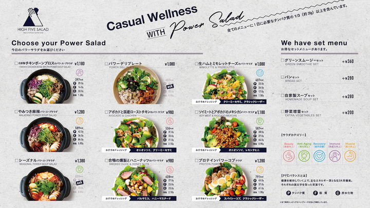 HIGH FIVE SALADがお届けしたいのは、Beauty(美容)、Anti-Aging(アンチエイジング)、Recovery(疲労回復)、Immune(免疫力向上)、Muscle(筋力アップ)の5つの効能。コロナ禍でかつてないほど健康意識が高まる中、サラダの提供を通じて、1人でも多くの方のウェルネスをサポートしてまいります。