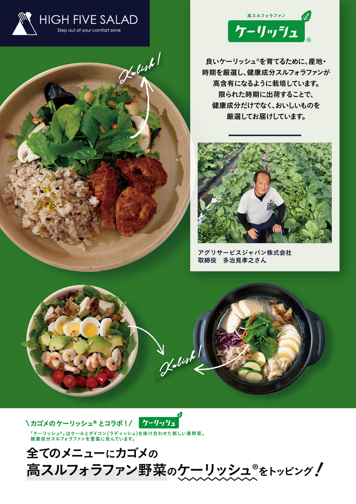 日本初のパワーサラダ専門店「HIGH FIVE SALAD」を運営する株式会社ハイファイブ(本社:東京都新宿区、代表取締役:水野裕嗣)は12月1日(水)、ケールと大根を交配させた新しい葉野菜の「ケーリッシュ®」を全てのパワーサラダ、パワースープサラダ、パワーデリプレートにトッピングとして提供します。